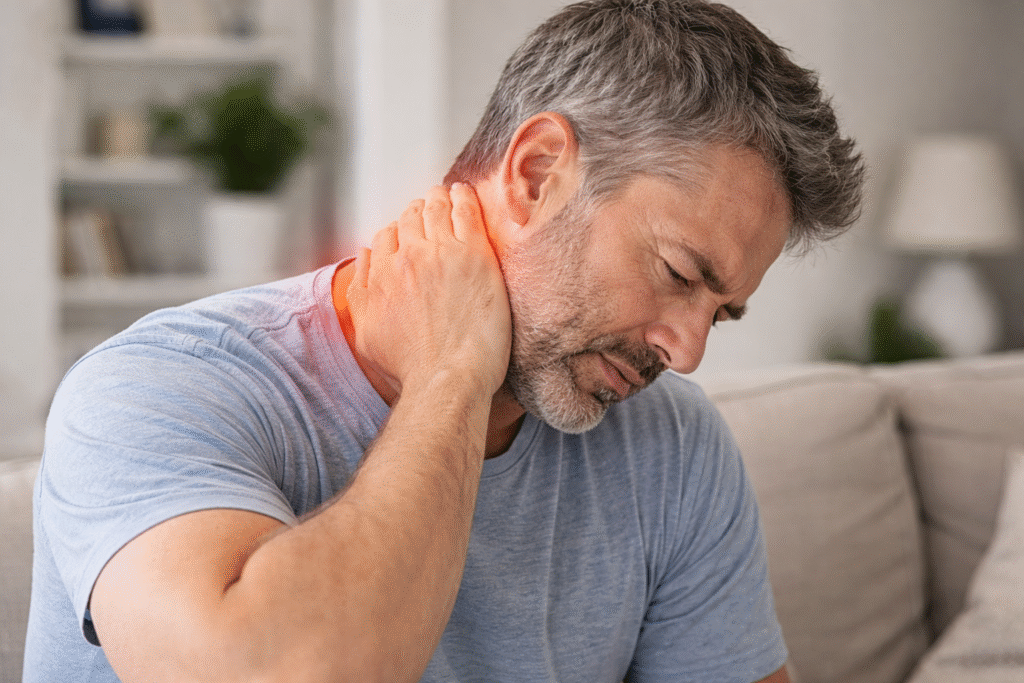 Cervical radiculopathy occurs when a nerve in the neck becomes irritated or compressed, often from a disc herniation or arthritis. Symptoms may include pain traveling into the shoulder or arm, along with numbness, tingling, or weakness in the hand or fingers.