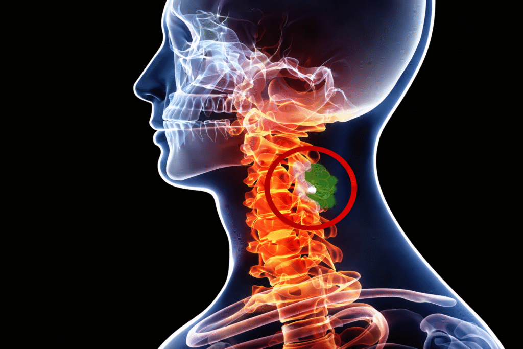 A cervical disc herniation occurs when part of a disc in the neck presses on a spinal nerve or the spinal cord. This can cause neck pain that radiates into the shoulders, arms, or hands, along with numbness, tingling, or weakness. Some patients may also experience reduced grip strength or coordination.